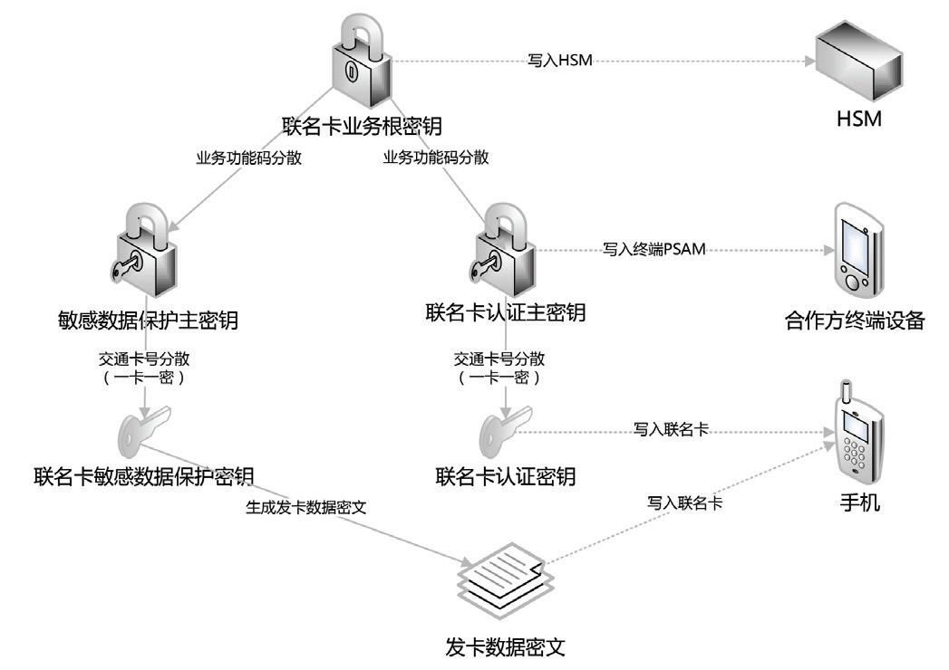 交通卡联合发卡:需要进行交通卡公司业务的联名,与通卡公司进行商务过程,但一般学校通常主要的学生、教职工群体只在一个城市,并且基于交通互联互通,也可以实现跨城的交通场景使用,需要解决通卡公司与校园卡联名后卡片发行业务的生命周期安全问题。