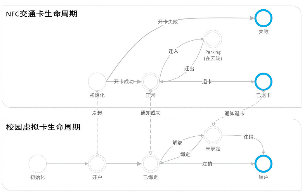 通过综合NFC交通卡与校园虚拟卡的生命周期,可以设计NFC校园虚拟卡的生命周期以及联名卡中交通功能与校园功能之间的的生命周期与交互如图8所示。