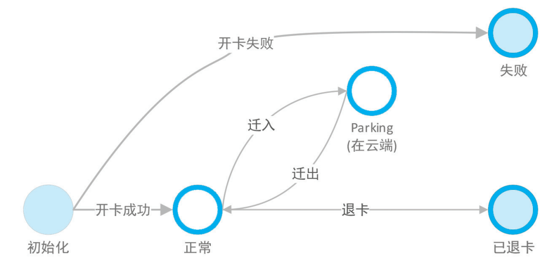 NFC虚拟交通卡生命周期主要有初始化、正常、开卡失败、Parking(迁入/迁出)、退卡等关键节点,如图6所示。